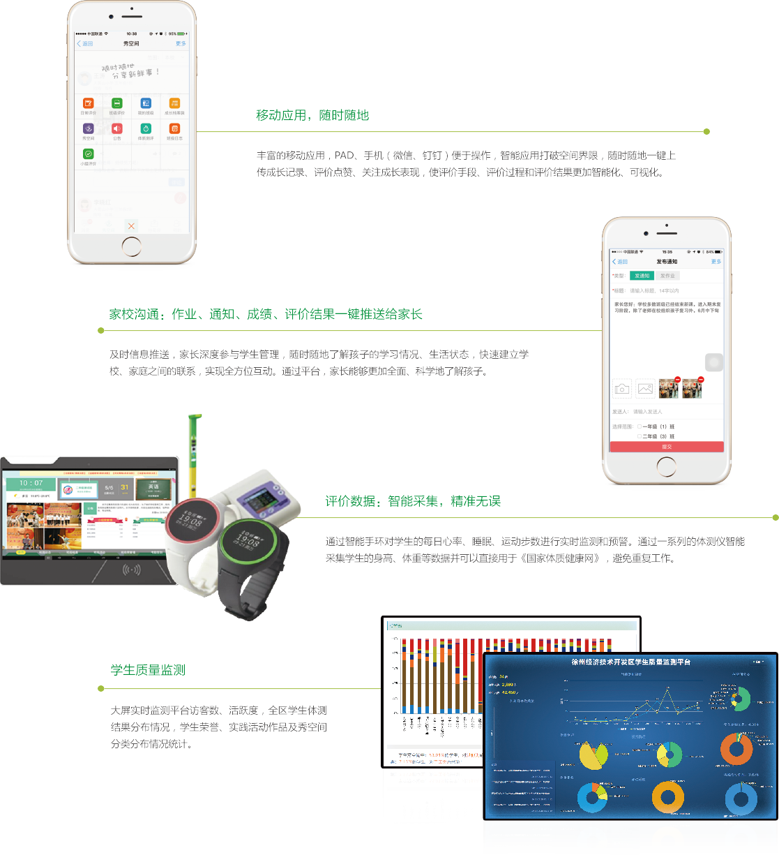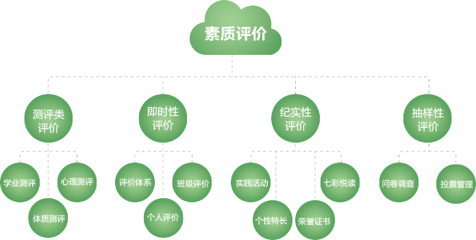 根據教育部《教基二[2013]2號》文件,以學生的品德發展水平、學業發展水平、身心發展水平、興趣特長養成、社會實踐五大維度列為評價標準,同時支持用戶指標靈活設置。